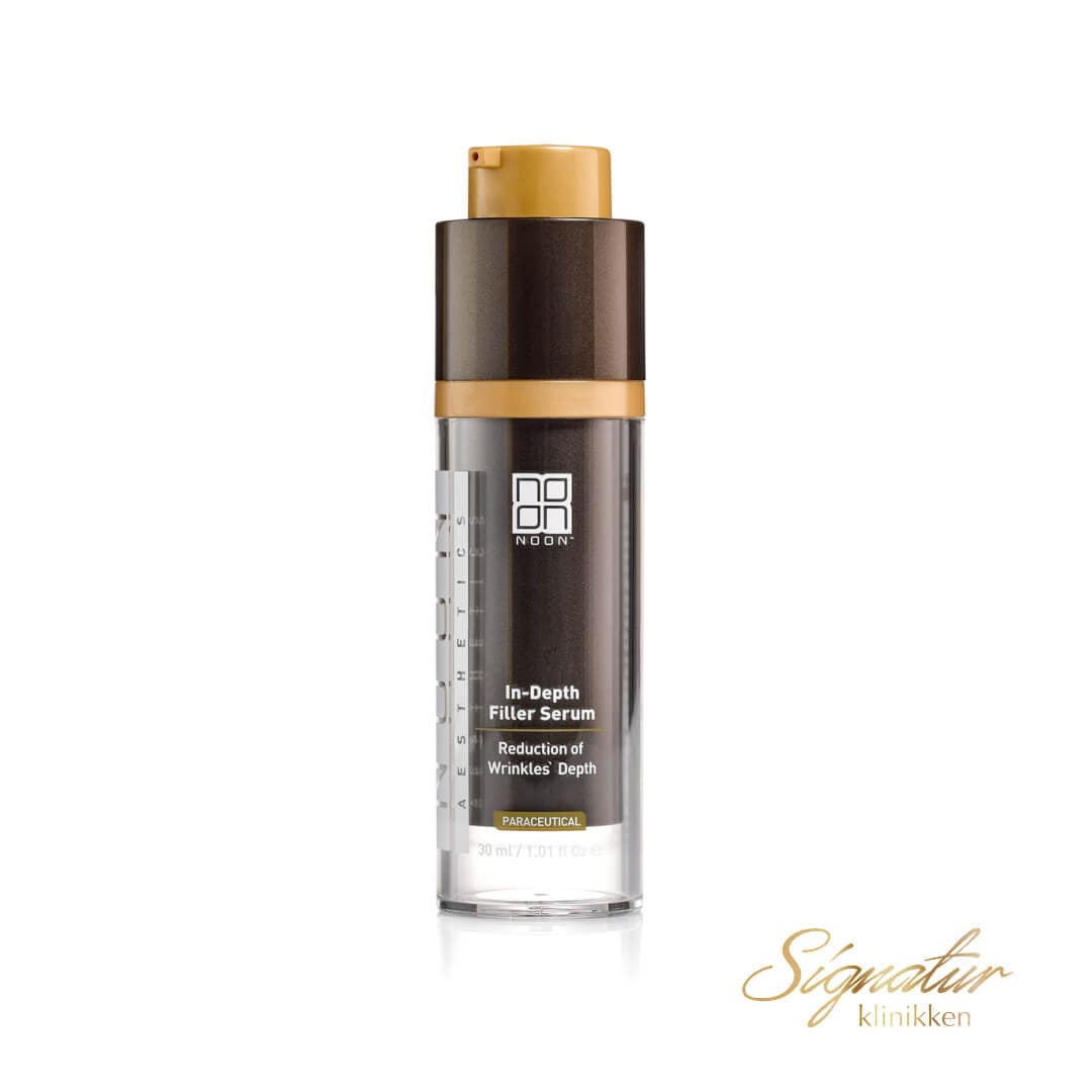 In-Depth Filler Serum er full av peptider og er en svært effektiv anti-rynkebehandling som virker i dybden. Den forbedrer hudens fylde, fasthet og elastisitet, samtidig som det gir fuktighet og glød til huden. Kan med fordel også anvendes på hals og decollotè.