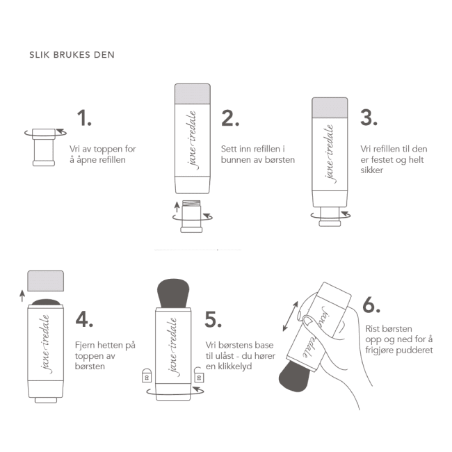 Skru av lokket for å åpne refillbeholderen. Sett inn en refill i bunnen av børsten. Vri refillen i bunnen til den er festet og helt sikker. Fjern hetten fra toppen av børsten. Vri børstens base til ulåst – du vil høre en klikkelyd. Rist børsten opp ned for å frigjøre produktet. Påfør på kropp, ansikt og hodebunn for solbeskyttelse.